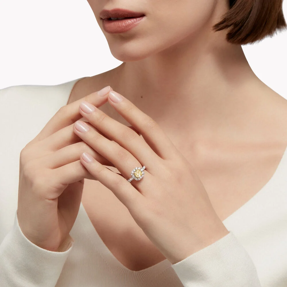 Model wears a charming Icon cushion cut yellow and pavé white diamond ring with a total weight of 2.93 carats, showcasing a certified 1.51 carat cushion cut Fancy Yellow diamond.
